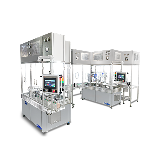 整机装有百级层流装置,实现无菌环境下进瓶灌装上压塞旋盖等工序。